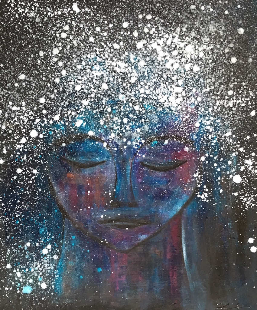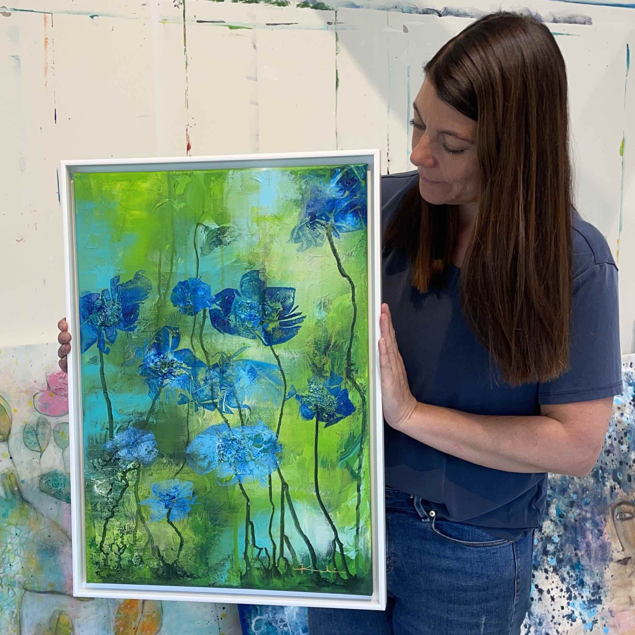 När målningen är klar och signerad kommer ofta titeln och därefter en text som förklarar vad just varje konstverk betyder för mig eller vill förmedla till omvärlden. Det är mitt sätt att djupdyka i mina tankar, tydliggöra och sätta ord på var som försiggår bakom kulisserna inne i mitt inre. Texterna är presenterade med varje originalmålning på Instagram och Facebook.