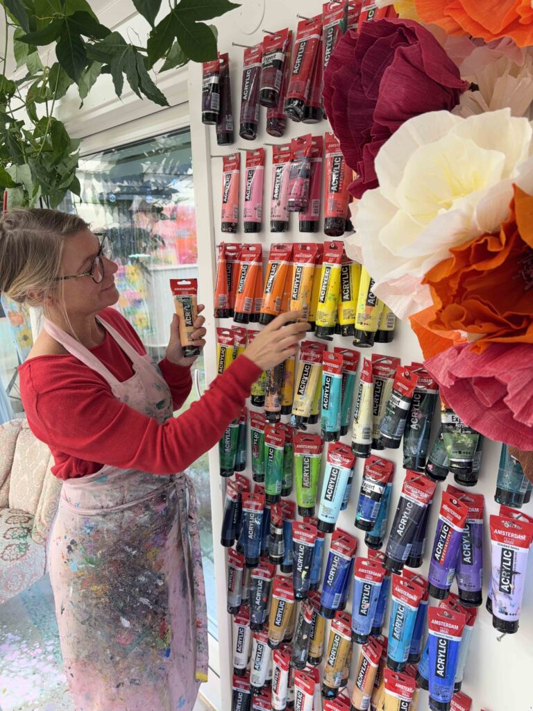 Som ni ser på bilden nedan har jag jättemånga färgtuber och ink kvar förutom i de rosa kulörerna och turkosgröna som börjar sina. Därför har jag bestämt mig för att fortsätta i samma anda 2026. Så det blir kul att följa färgskalorna som föds under kommande år och hur de kan öppna upp för nya vägar och upplevelser. Kanske att den rosa älsklingen får konkurrens av en oväntad nyans?