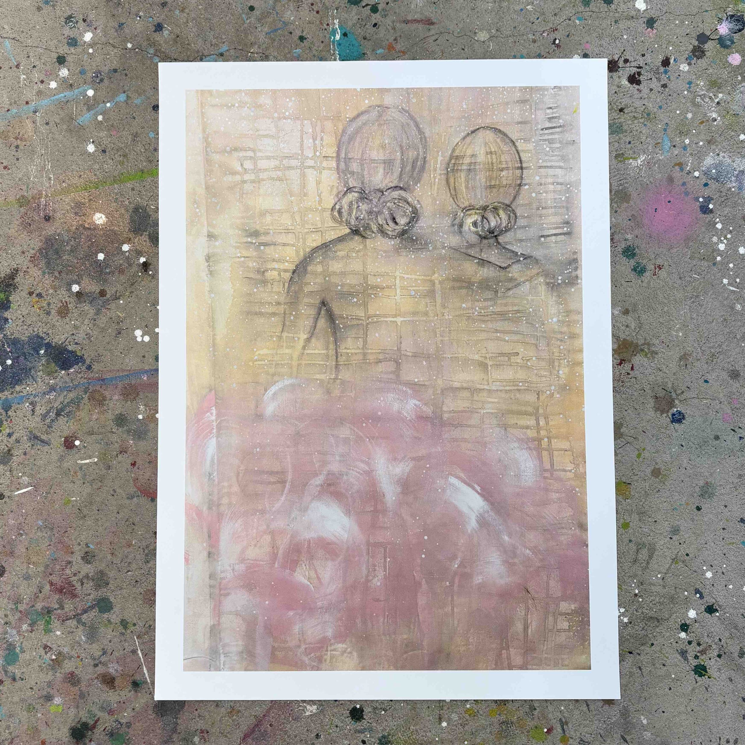 Vi två – tills hjärtat slutar slå. I varje andetag, varje sekund, varje stund, sida vid sida. Målningen alstrar samhörighet och en outsinlig brunn av villkorslös kärlek. Två systrar, tillsammans genom livet – innerligt och ödmjukt. Min syster och jag.