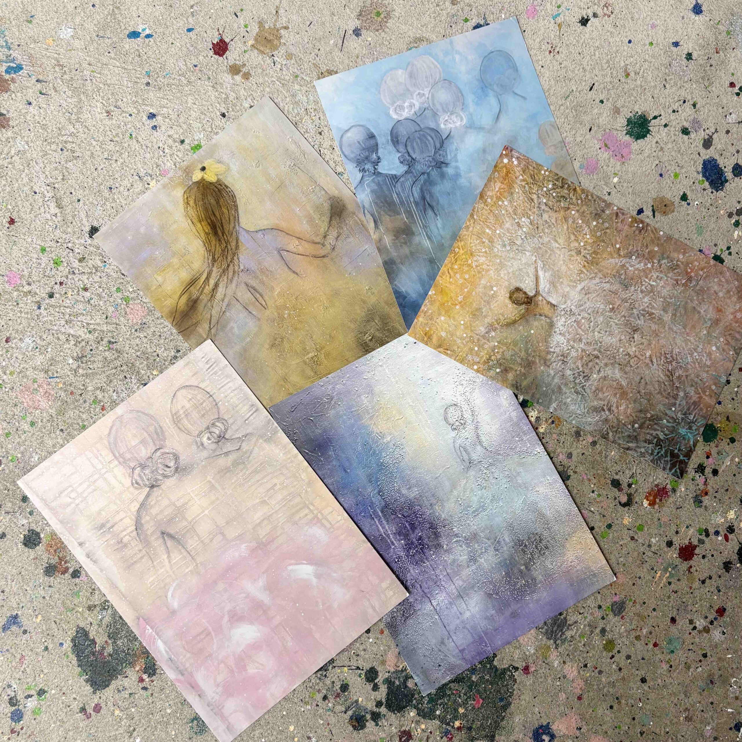 5 st vackra blanka konstkort A5 i fin kvalitet. Passar likväl att rama in som att skicka till en vän eller förgylla gåvan med. Motiv från originalmålningarna ”Ljussyster”, ”Sol”, ”Systrar”, ”Stjärnsyster” samt ”Min syster & jag” med tillhörande text skrivet på baksidan. Fri frakt!